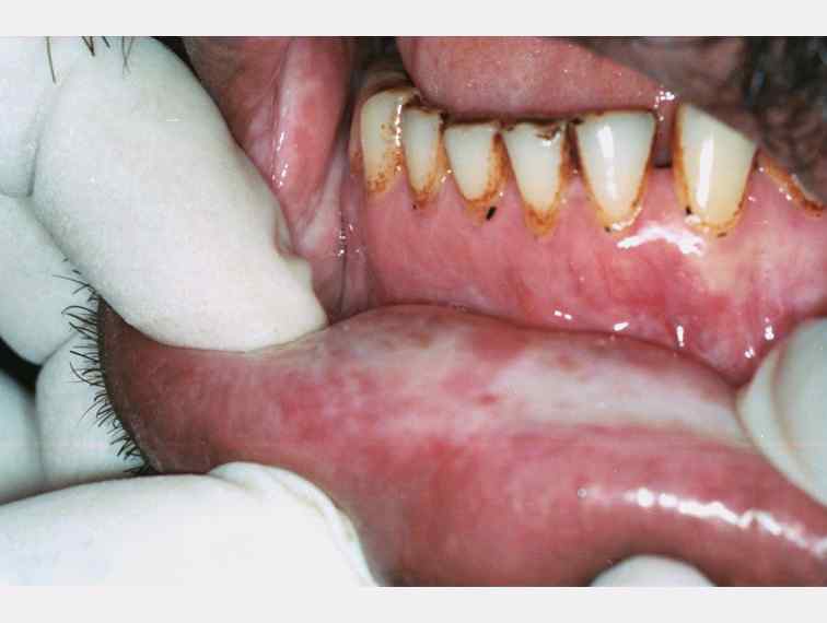 In the initial phase of the disease, the mucosa feels leathery with palpable fibrotic bands. In the advanced stage the oral mucosa loses its resiliency and becomes blanched and stiff. The disease is believed to begin in the posterior part of the oral cavity and gradually spread outward.